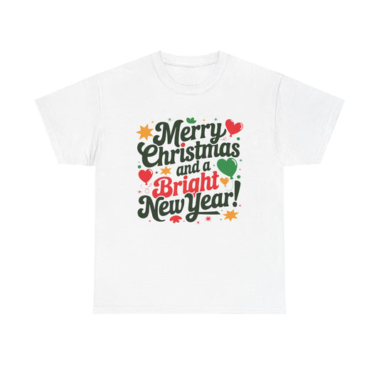 Bright New Year T-Shirt | Christmas Holiday Design | Festive Hearts & Stars | Season's Greetings Tee | Unisex Heavy Cotton Tee
