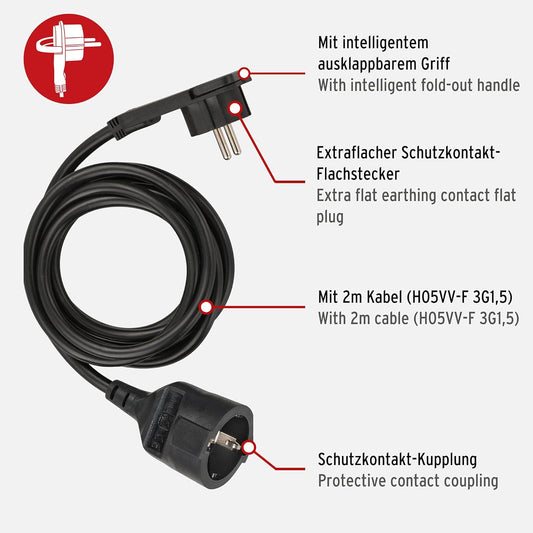 Brennenstuhl Qualitäts-Kunststoff-Verlängerungskabel Mit Flachstecker (Verlängerungskabel Flach Für Innen Mit 2M Kabel) Schwarz