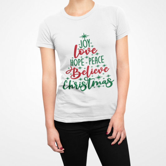 Joy Love Peace Christmas T-Shirt | Holiday Word Tree | Christmas Spirit Design | Festive Typography | Unisex Softstyle Christmas T-shirt