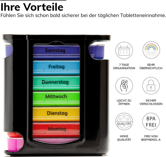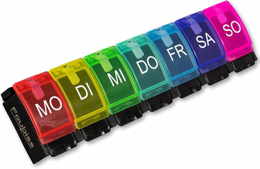 Foubiss - Tablettenbox 7 Tage Mit Druckknopf - BPA Frei - Medikamentenbox Große Fächer - Perfekt Für Unterwegs - Pillendose 7 Fächer Morgens - Bunt