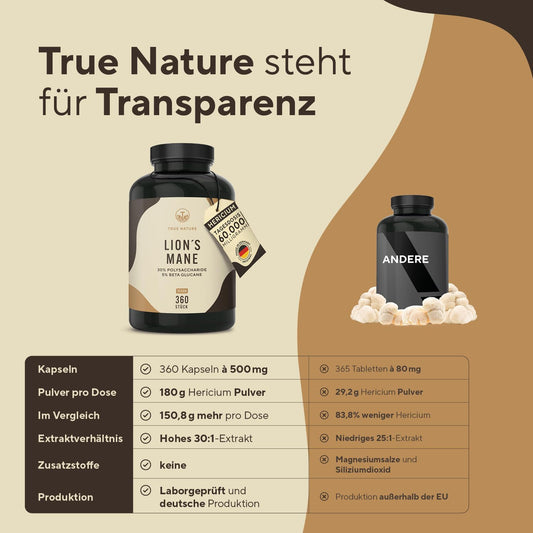 Lions Mane - 360 Kapseln - 15000Mg Hericium Erinaceus Je Kapsel - 60000Mg Je Tagesdosis - 30:1 Löwenmähne-Extrakt Mit 30% Polysacchariden & 5% Beta Glucan - Vegan, Deutsche Produktion - TRUE NATURE