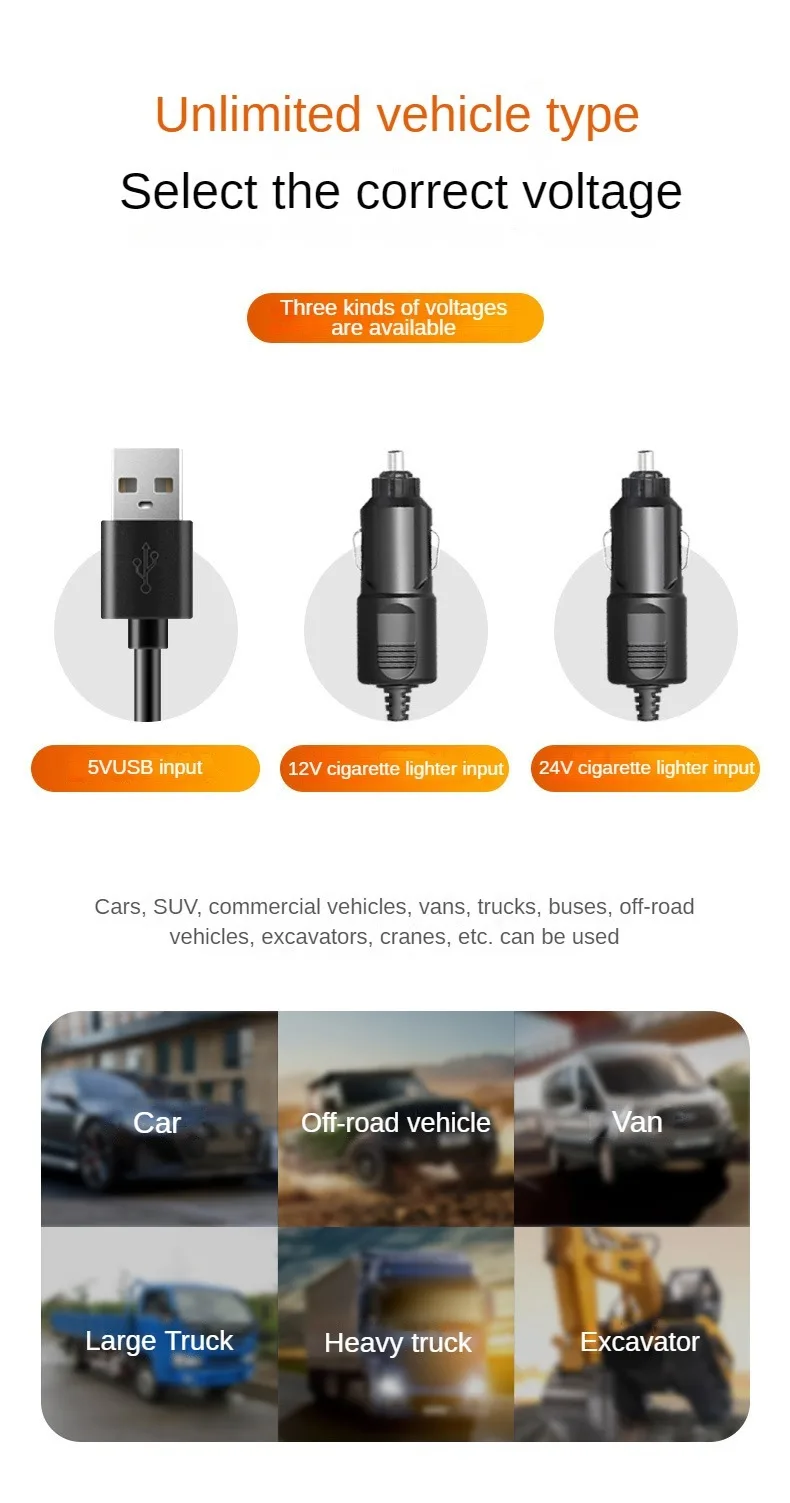 12V: cigarette lighter interface, suitable for minibuses, school buses and off-road vehicles.