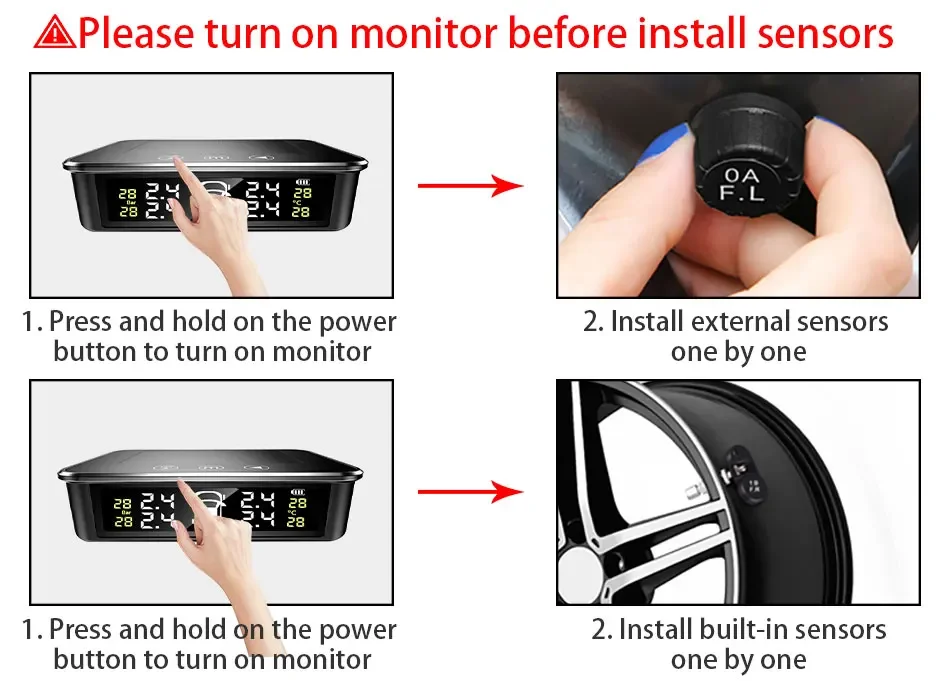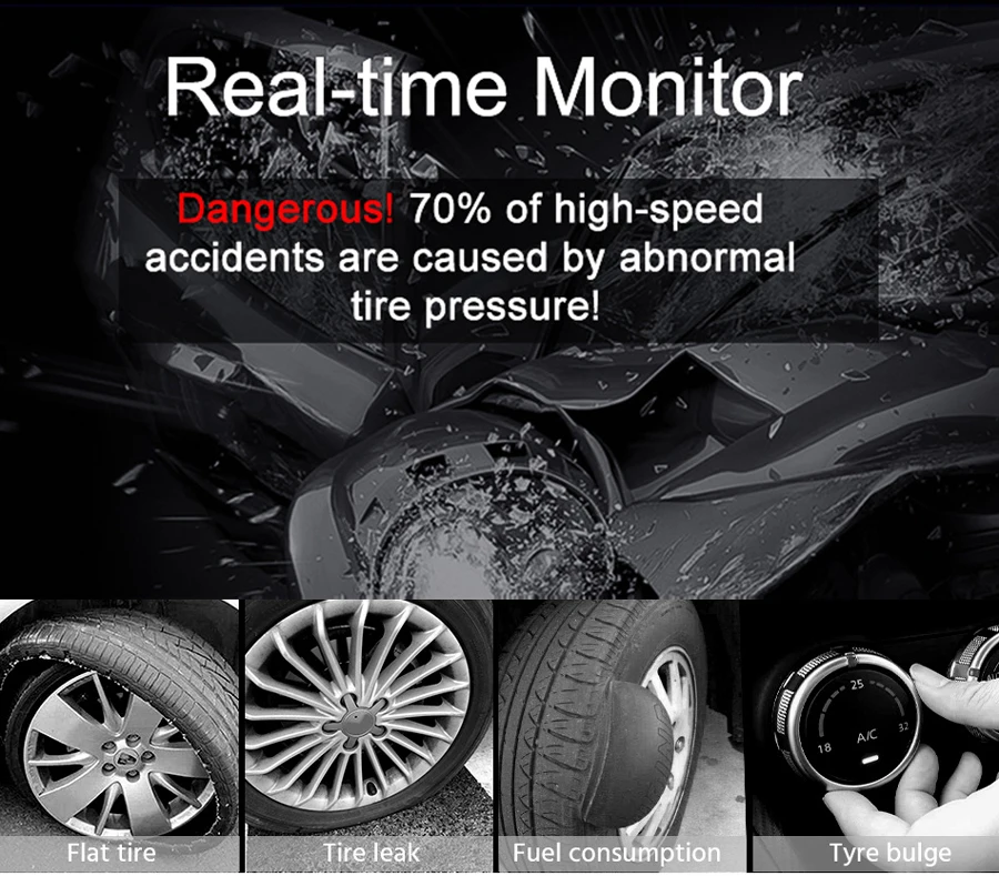 Screen display can clearly display 4 tires' pressure andtemperature in real-time to ensure driving safetyοΌ
