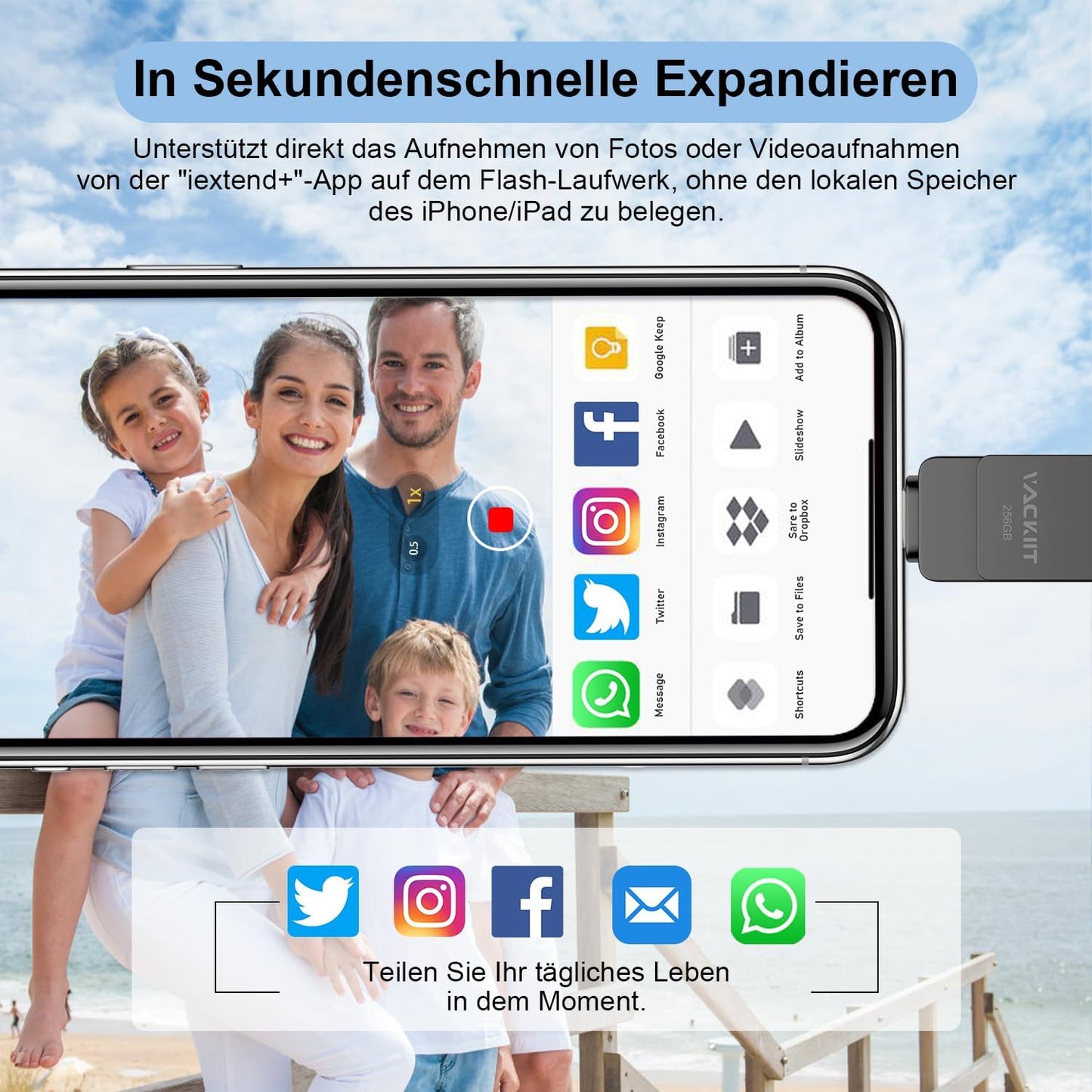 - 【Starke Datenverschlüsselungstechnologie】Sichern und schützen Sie Ihre wertvollen Daten mit der leistungsstarken Datenschutztechnologie des Vackiit USB Sticks. Laden Sie die kostenlose iExtend+ App aus dem App Store herunter (Android Geräte benötigen diese nicht) und richten Sie ein Passwort, Touch ID oder Face ID ein, um Ihre Daten zu sichern. Ihre persönliche Privatsphäre bleibt garantiert geschützt, selbst wenn der Stick verloren geht. Die Anwendung ist ebenfalls sicher für Ihre Nutzung.