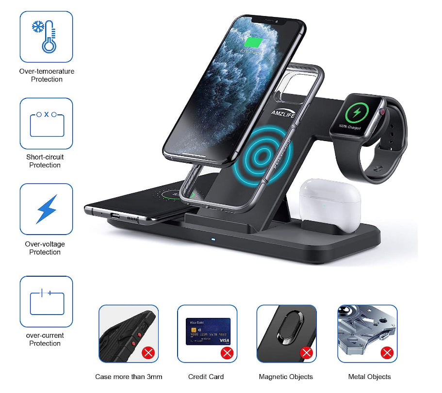 • 4-in-1 wireless charger: with Qi-certified wireless charger, 4-in-1 inductive charging station, compatible with iPhone, Apple Watch, Airpods, Samsung, LG, HTC, Huawei, Sony, Xiaomi and other Qi-enabled devices. Charge multiple devices at the same time, tidy and organised. Best charging experience: Quick charge QC3.0 need 18W charger above (included). Original Apple Watch magnetic charger charging cable is required (not included).